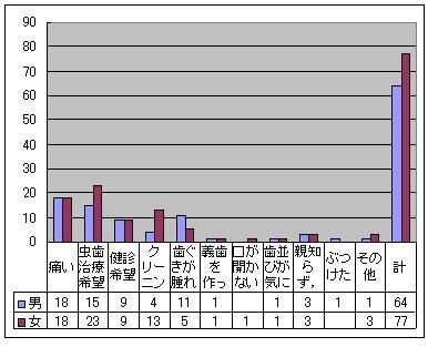 当院のやや古いデータですが「健診希望」と「ティースクリーニング」を希望されての来院の方々が比較的多いのが当院の特徴です。